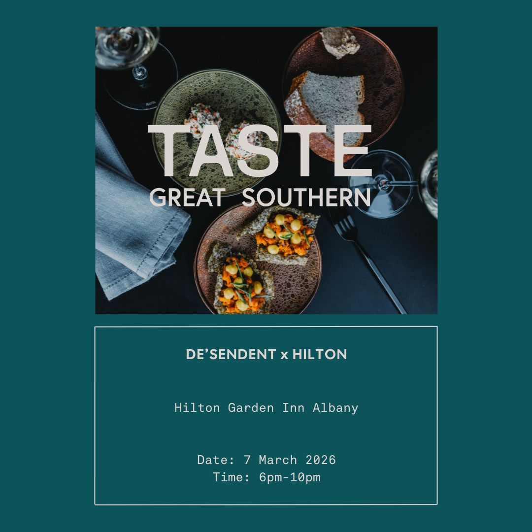 Renowned for an ethos dedicated to fine dining in picturesque settings, Chef Evan Hayter (de’sendent Margaret River) finds his perfect match here in the Great Southern. Hosted by Hilton Garden Inn Albany, expect a refined yet grounded four-course dinner showcasing premium, local produce reimagined through Chef Evan’s culinary philosophy including Albany Rock Oysters. The night’s menu will be paired with premium Duke’s Vineyard wines, with Owner and Winemaker Ben Cane on hand to dive into the unique terroir of the Porongurup region that shapes each glass. An intimate evening between two champions of premium produce and a deep care for the land.