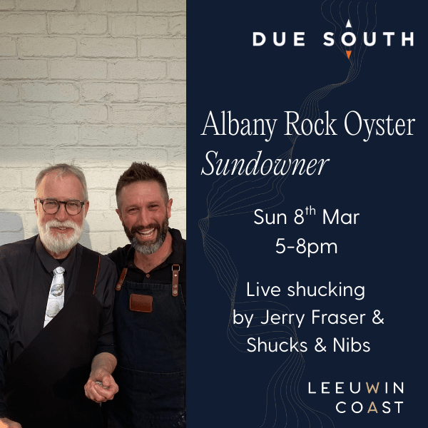 Enjoy freshly shucked oysters by Perth's Oyster King Jerry Fraser and Tom from Shucks and NIbs with a drink as the sun goes down at Albany's wonderful waterside venue, Due South.
